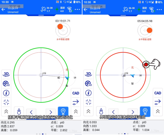 3、根據(jù)放樣界面提示向放樣點(diǎn)移動,地圖上實(shí)時顯示放樣位置的方向,隨著手簿正前方的變化進(jìn)行對應(yīng)的變化,滿足測量配置中配置的放樣精度值時,界面提示紅圈表示放樣完成。如圖所示: