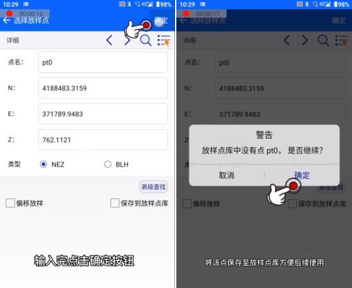 2、輸入放樣坐標(biāo)點(diǎn),輸入完畢,點(diǎn)擊【確定】,是否繼續(xù)點(diǎn)擊【確定】,將該點(diǎn)保存至放樣點(diǎn)庫方便后續(xù)使用。如圖所示: