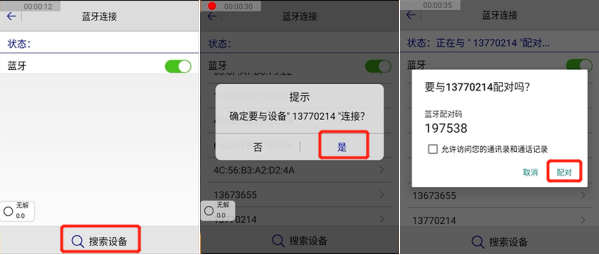 2、搜索頁面點擊【底部搜索按鈕】,查找附近藍牙設備,選擇對應的主機機身號,點擊【是】-【配對】,進行藍牙配對連接。如圖所示: