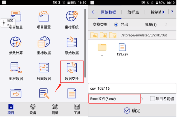 1、進入Hi-Survey軟件界面,點擊【項目】-【數據交換】,進入數據導出界面,點擊下方紅色框中文件,如圖所示: