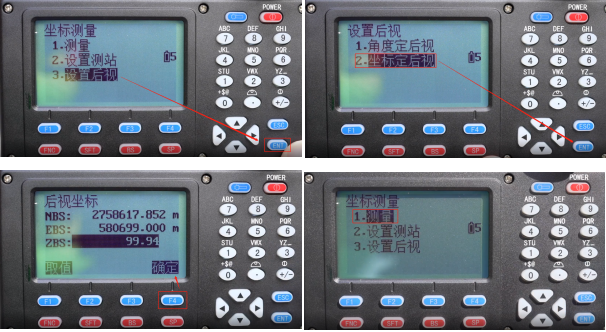 2、返回坐標(biāo)測量界面,點(diǎn)擊【設(shè)置后視】-【ENT】確認(rèn)鍵,選擇【坐標(biāo)定后視】-【ENT】確認(rèn)鍵。進(jìn)入后視坐標(biāo)界面,依次輸入后視點(diǎn)坐標(biāo),點(diǎn)擊【F4】確定。進(jìn)入坐標(biāo)測量界面點(diǎn)擊【測量】-【ENT】確認(rèn)鍵,如圖所示: