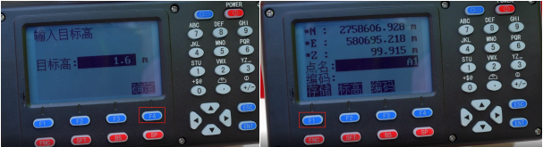 3、核對測出來的坐標(biāo)和輸入的坐標(biāo)是否一致,點(diǎn)擊【F4】觀測鍵→觀測待測點(diǎn)的坐標(biāo)數(shù)據(jù),點(diǎn)擊【F1】記錄坐標(biāo),修改【點(diǎn)名】,如圖所示。(注:SFT鍵可以切換字母鍵盤和數(shù)字鍵盤)