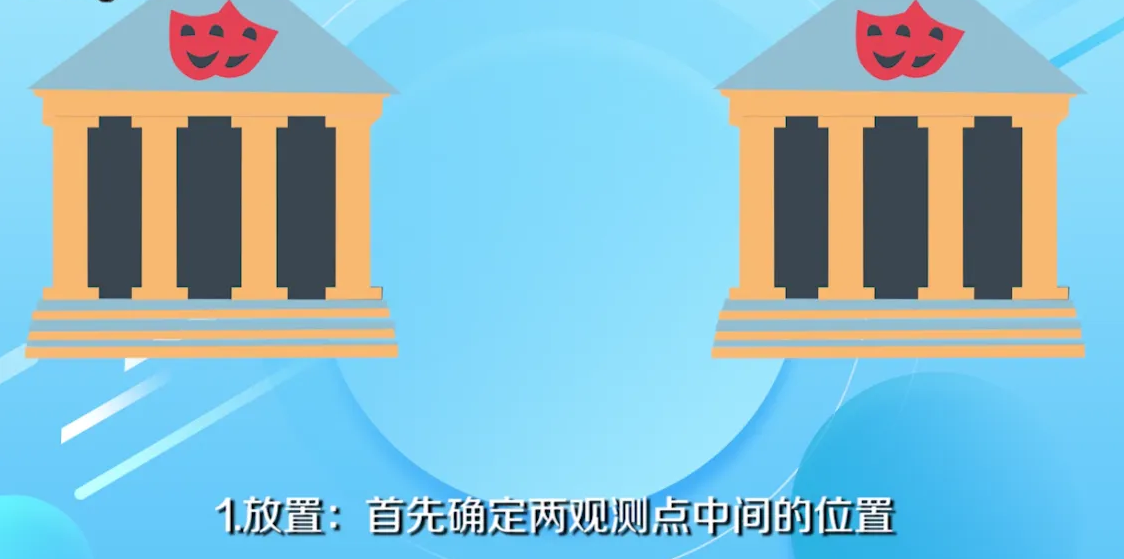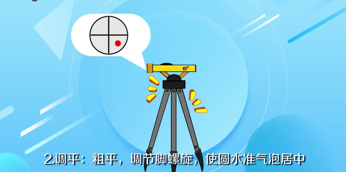 2、調平。調節腳螺旋,使圓水準氣泡居中,用望遠鏡準確瞄準目標,定位測量的位置。如圖所示: