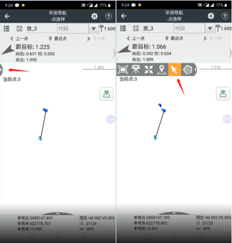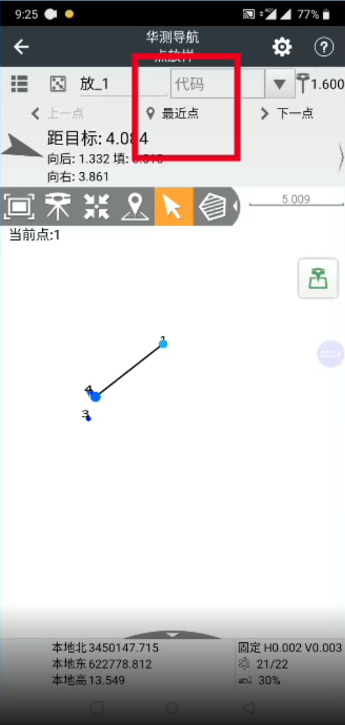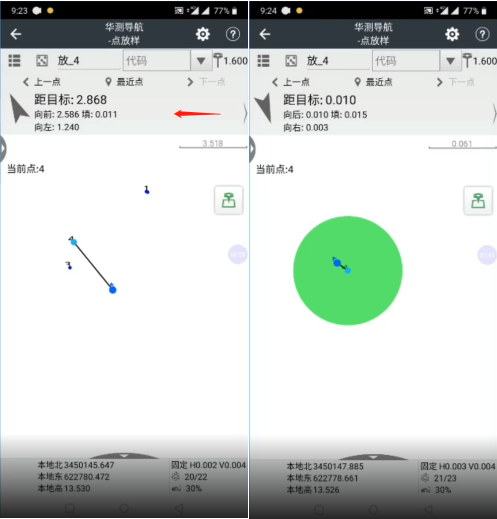 3、回到點放樣界面,滑動屏幕可切換距離指示的方式,按箭頭指示方向前進,即可找到目標點,當聽到語音提示和看到綠色標志時,證明找到點位。如圖所示: