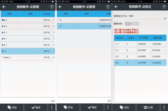 6、GNSS點為測量的點坐標,已知點為輸入的點坐標。點擊右邊圖標,進入點管理頁面,點擊已經采集的點坐標,點擊【確定】,坐點校正一般需要添加三個以上的點。如圖所示: