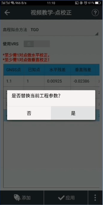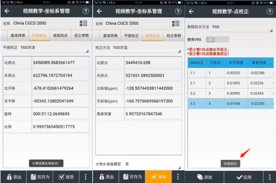 8、進入坐標系管理,平面校正和高程擬合為點校正參數,確認無誤后,點擊【接受】,應用成功證明點校正完成。如圖所示: