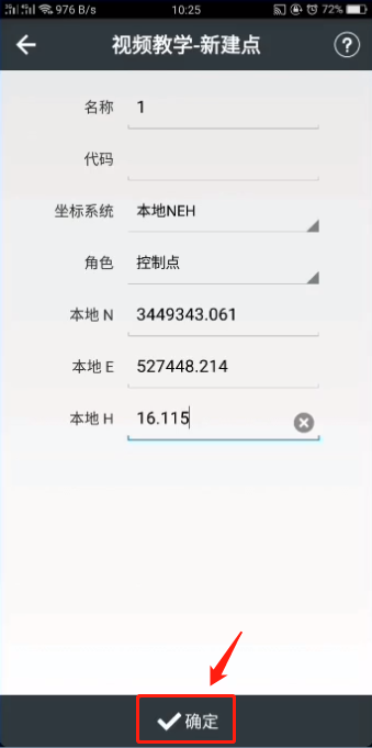 2、進入新建點,名稱輸入“1”,角色選擇【控制點】,手動輸入坐標點,點擊【確定】。如圖所示: