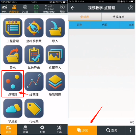 1、進入LandStar7版軟件頁面,找到下方項目選項,點擊【項目】-【點管理】- 【添加】,如圖所示: