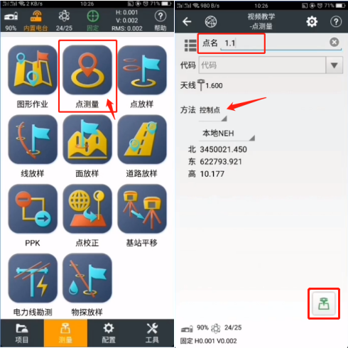 3、返回軟件界面,點擊【測量】-【點測量】,輸入點名“1.1”,方法選擇【控制點】,測量完畢點擊右下角圖標,再次測量輸入點名‘1.2’,測量第二個坐標...將需要做點校正的控制點坐標全部輸入,并且全部測量一遍。當所有的控制點都輸入并測量完成后,即可開始點校正。如圖所示: