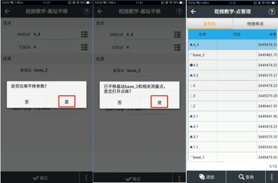 5、是否應用平移參數選擇【是】,是否打開點庫選擇【是】,點坐標相匹配則基站平移完成。