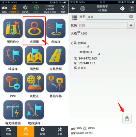 1、進入LandStar7版軟件頁面,找到下方測量選項,點擊【測量】-【點測量】- 修改【點名】進行測量,測量完畢后點擊右下角圖標,將所有的控制點都輸入并測量完成,如圖所示: