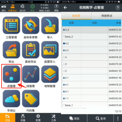 2、返回軟件界面,找到下方項目選項,點擊【項目】-【點管理】,如果基站發生了變化,需要做基站平移,如圖所示: