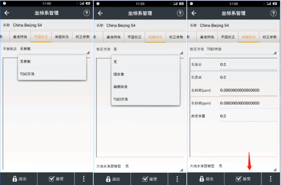 ④點校正參數在“平面校正”和“高程擬合”里查看。設置完畢后,點擊右下角【接受】,如圖所示: