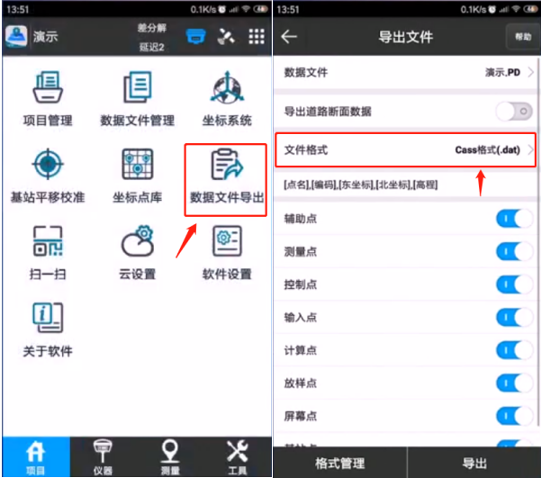 1、打開手簿,運行UFOPad專業版測量軟件,進入主菜單,點擊【項目】-【數據文件導出】,進入“導出文件”頁面,點擊“文件格式”,向下滑動選擇需要導出的格式。如圖所示:
