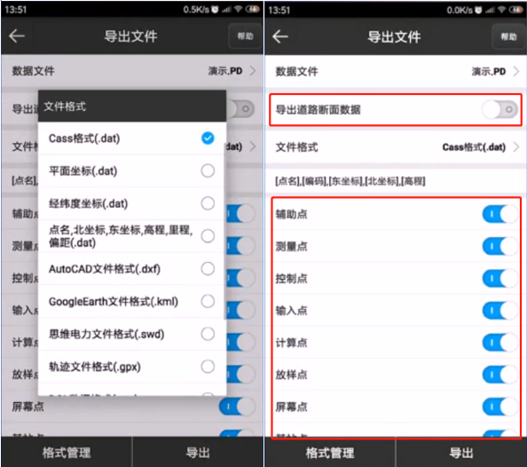 2、導出文件中可以勾選導出道路斷面并選擇斷面格式(注:部分格式不支持選擇導出斷面,需要額外選擇斷面格式),也可以點擊下面的開關篩選導出的點類型,如圖所示: