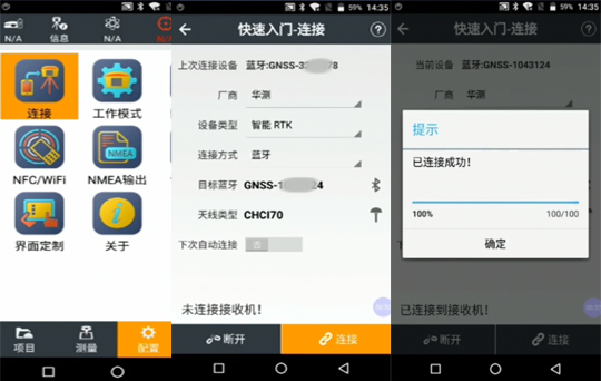 連接基站:軟件主頁點擊“配置”,選擇“連接”;進入快速入門-連接界面,選擇設備類型“智能RTK”、連接方式“藍牙”、目標藍牙“選擇設備號”、天線類型“CHCI70”(與設備型號相同)、選擇完成,點擊“連接”。提示已連接成功!點擊“確定”。