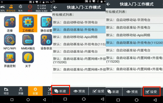 基站連接成功,返回配置界面,點擊“工作模式”,進入快速入門(項目文件名)-工作模式界面,點擊“新建,”然后選擇數據接收方式、IP端口等保存,或者在工作模式界面選擇默認的工作模式,點擊“接受”。