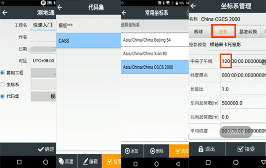 在“測地通”界面輸入工程名“快速入門”,套用之前的工程的參數,根據需要選擇相應的代碼集CASS,點擊“接受”,選擇“坐標系”,進入常用的坐標系界面選中“CGCS2000”,點擊“選擇”,進入“坐標管理”界面,選擇“投影”修改中央子午線,點擊“接受”,彈出“應用成功”透明對話框返回到“測地通”界面,點擊“確定”。創建工程成功即可。