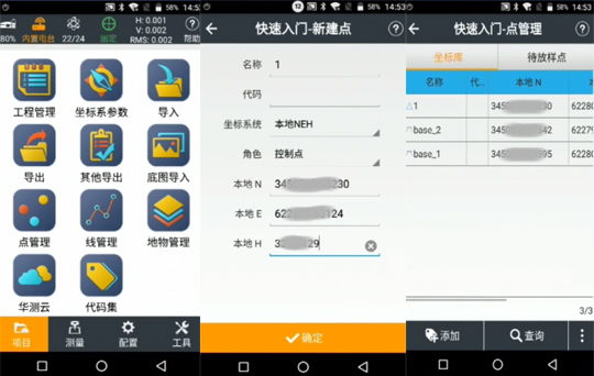 1、輸入控制點坐標:手簿主頁點擊“項目”,選擇“點管理”。進入界面,點擊“添加”,進入新建點界面,輸入名稱、NEH信息,輸入完成點擊確定,然后同理添加三個以上控制點進行點校正。