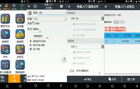 2、手簿主頁點“測量”—點測量,然后修改天線高、方法“控制點”,選擇點擊右側采集圖標依次采集即可。采集完成,返回測量界面,點擊“點校正”,點擊添加,選擇GNSS點(測量點)和已知點(輸入點)點擊確定,返回點校正界面,點擊“計算”并應用。