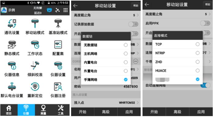 執行[儀器] ->[移動站模式] , 數據鏈模式選擇[手簿網絡] , 設置好CORS服務器的IP和端口,獲取并選擇接入點,其他選項可以使用默認數值,點擊[應用],工作模式設置完畢。返回主界面可以查看是否得到固定解。得到固定解后,可以進行下一步操作。