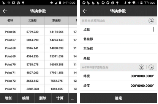 執行[工具]->[轉換參數],輸入已知點坐標(坐標點庫中選取或手動輸入) 和WGS 84橢球原始坐標(獲取當前GPS數據、坐標點庫中選取或手動輸入),設置是否使用平面校正和高程校正,點擊[確定],完成轉換參數的輸入。在轉換參數界面點擊[計算] 得到GPS參數報告。