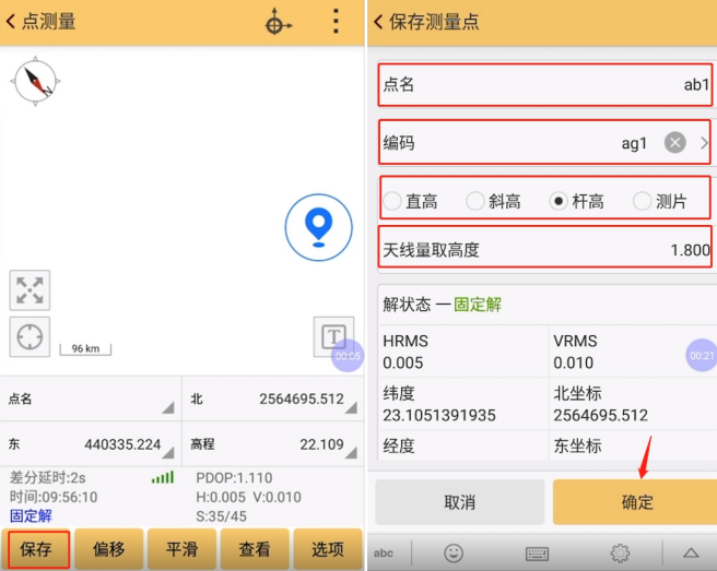 2、進入點測量頁面,點擊左下角【保存】,進入保存測量點頁面,輸入【點名】、【編碼】、選擇【桿高】、輸入【天線量取高度】,點擊【確定】,返回界面,即可完成該點的采集。如圖所示: