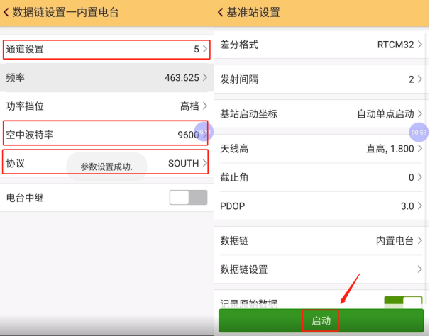 3、設(shè)置好電臺(tái)通道-【通道設(shè)置】、【波特率】、【電臺(tái)協(xié)議】,設(shè)置完畢后,返回基準(zhǔn)站設(shè)置界面,點(diǎn)擊【啟動(dòng)】,完成基準(zhǔn)站配置。如圖所示: