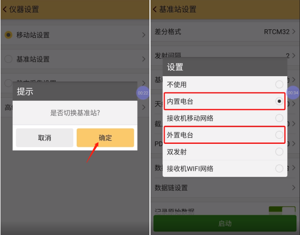 2、進(jìn)入儀器設(shè)置頁面,選擇【基準(zhǔn)站設(shè)置】,進(jìn)入數(shù)據(jù)鏈選擇界面,作為電臺(tái)工作模式時(shí),數(shù)據(jù)鏈選擇有兩種,這里以內(nèi)置電臺(tái)為例,選擇【內(nèi)置電臺(tái)】,如圖所示: