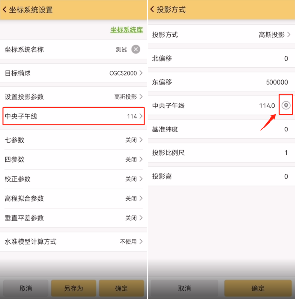 3、返回界面,按實(shí)際需求選擇對應(yīng)的投影方式,默認(rèn)為“高斯投影”,點(diǎn)擊【中央子午線】,可以直接手動(dòng)輸入,也可以點(diǎn)擊紅色框中按鈕,自動(dòng)獲取當(dāng)前作業(yè)區(qū)域中央子午線,如圖所示: