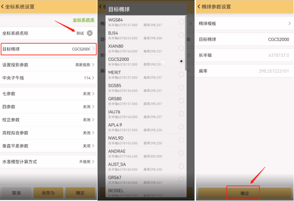 2、進(jìn)入坐標(biāo)系統(tǒng)設(shè)置頁面,輸入“坐標(biāo)系統(tǒng)名稱”,點(diǎn)擊【目標(biāo)橢球】,按實(shí)際需求選擇對應(yīng)的目標(biāo)橢球,選擇完畢后,點(diǎn)擊【確定】,如圖所示: