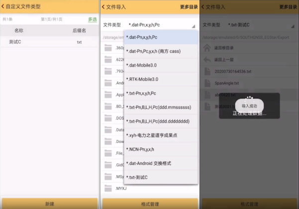4、返回頁面,在文件類型下拉菜單,找到并選擇新建的自定義文件類型,找到提前導入手簿相同格式的坐標文件,點擊文件,完成導入。如圖所示: