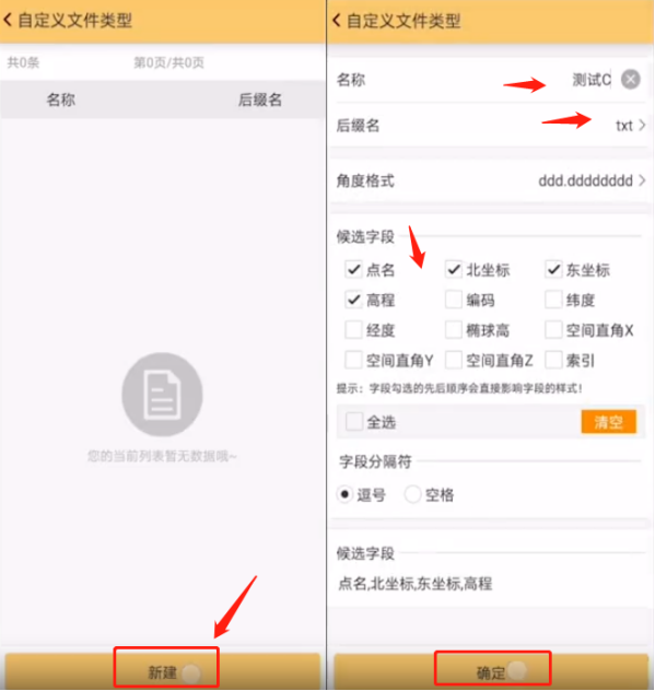 3、進入自定義文件類型頁面,點擊【新建】,輸入【名稱】-【后綴名】-選擇【候選字段】,點擊【確定】。如圖所示:
