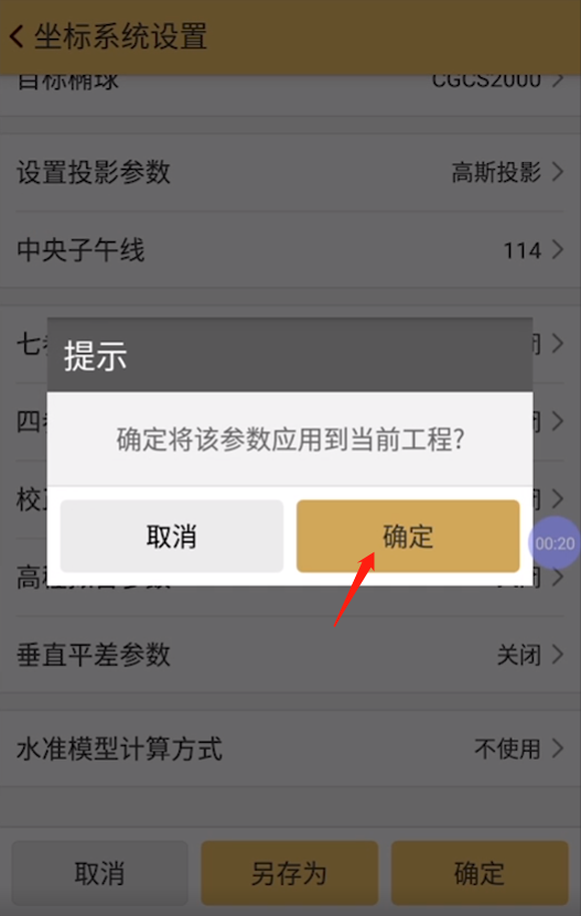 3、確認中央子午線是否與當地一致,點擊【確定】。確認將該參數應用到當前工程,點擊【確定】,即可完成新建工程操作。如圖所示: