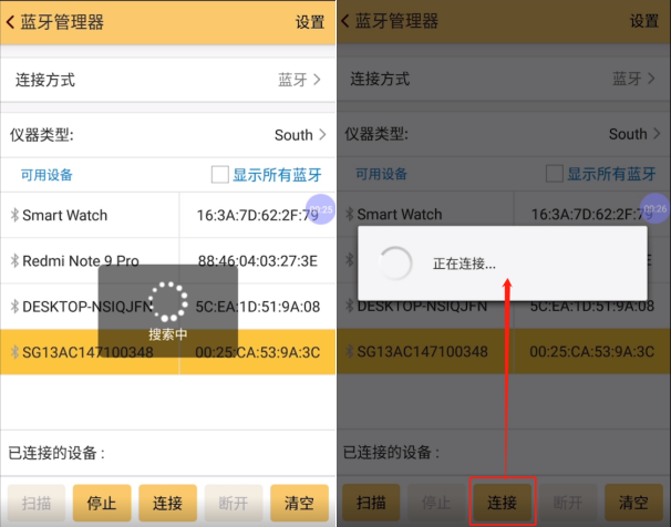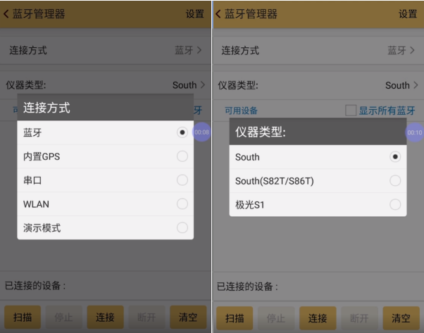 2、連接方式選擇【藍牙】,儀器類型選擇【SOUTH】,如圖所示:
