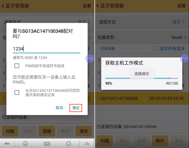 4、輸入PIN碼(PIN碼默認為1234),點擊【確定】-【連接】,頁面顯示連接成功,則完成儀器連接。如圖所示: