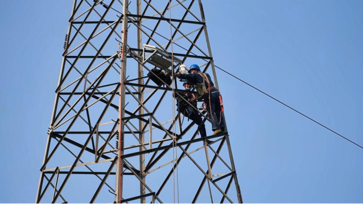 國家電網員工為處于泄洪區的桿塔安裝電力北斗桿塔傾斜監測終端