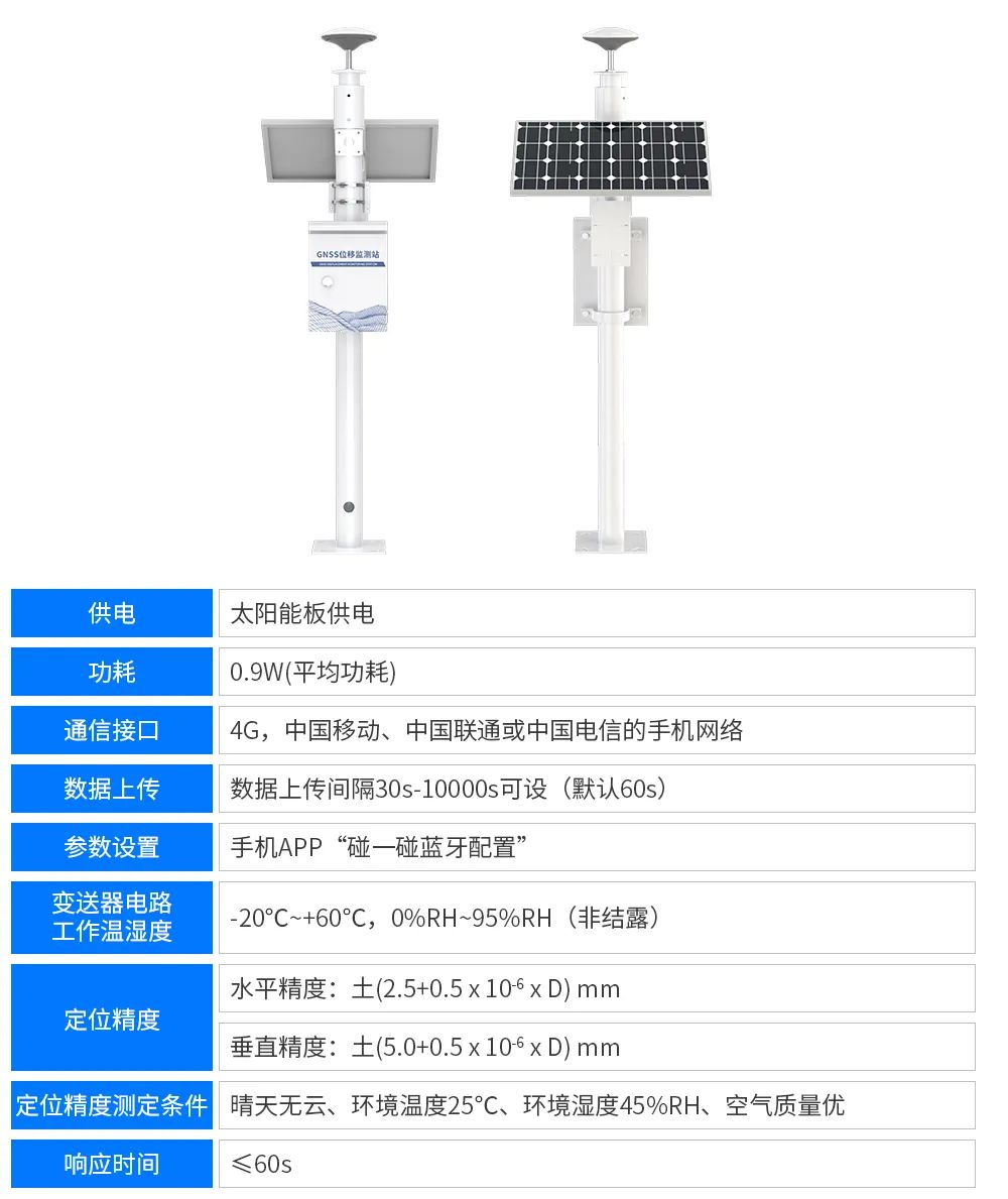 GNSS 位移監測站主要由 GNSS 天線、太陽能電池板、主控制機箱(內有主控傳輸模塊)和安裝支架組成,設備分為基準站和測量站,采用了RTK差分定位技術,可以根據測量出的已知位置的衛星到監測站之間的距離,再綜合多顆衛星的數據,就能得出位移變化的具體位置。