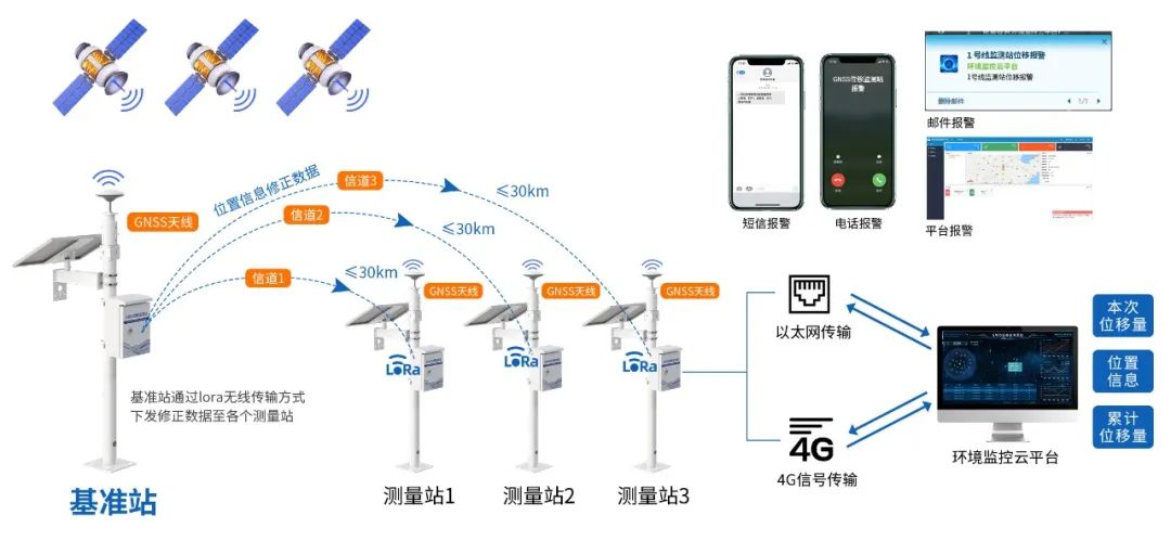 GNSS位移監測站會自動將監測到的位移變化數據通過4G或以太網的方式上傳至環境監控云平臺,用戶可以隨時隨地在手機或電腦上登錄平臺查看實時、歷史、報警數據,并導出、打印,還可以查看不同監測站所在地理位置及在線/離線信息。