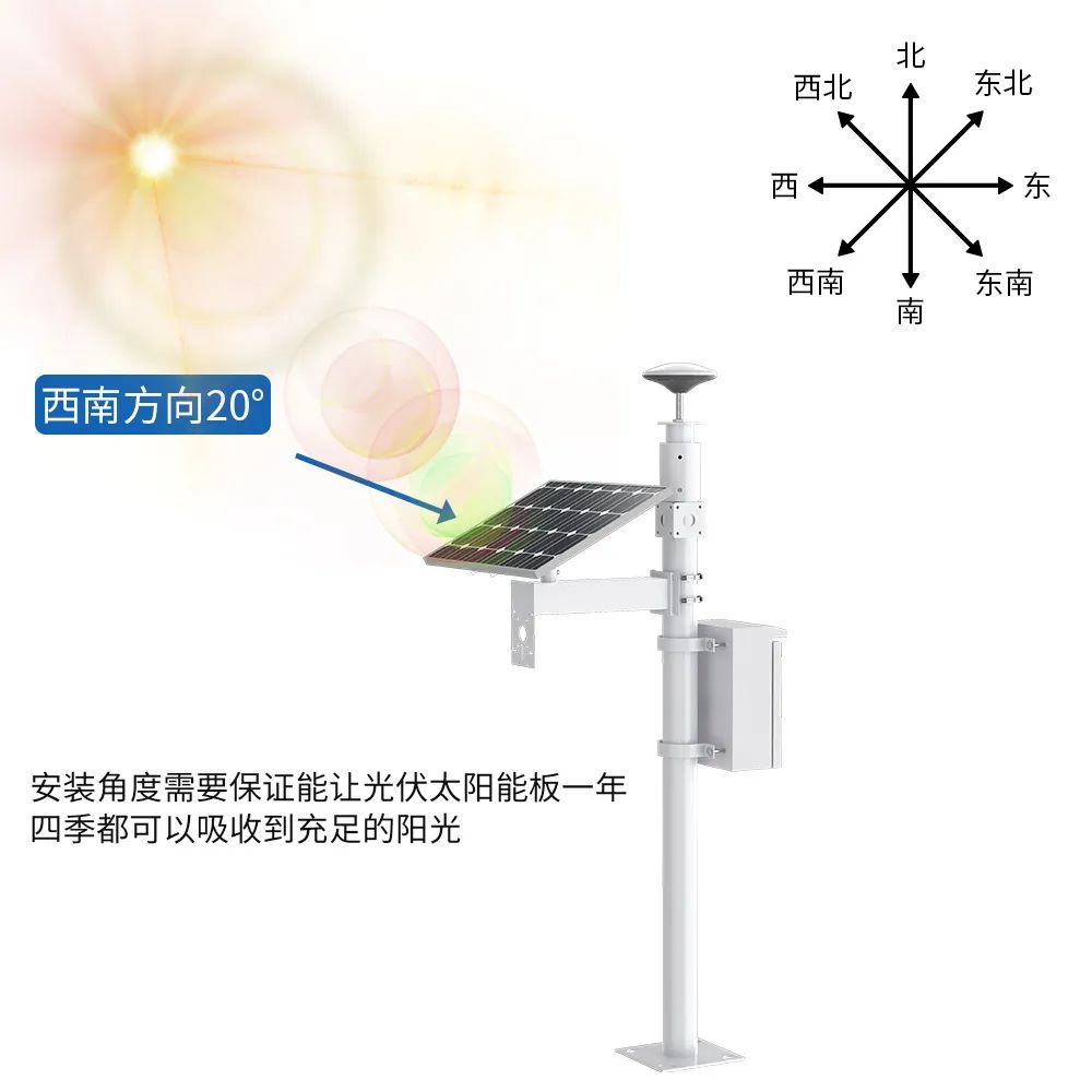 其次考慮方位朝向。經過科學考證,光伏太陽能板在正南時發電效率非常高,所以在安裝時要將其控制在正南方向左右。因為GNSS位移監測站年復一年的在戶外工作,一年四季光照范圍不同,需要綜合考慮,經驗證,光伏太陽能板的安裝角度最好控制在西南方向20°之內(因為這個角度無論是夏季還是冬季都能讓光伏太陽能板吸收到足夠的光照),以確保設備續航無憂。
