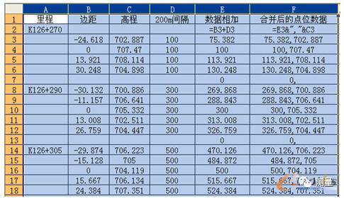 將現場測量數據錄入Excel中,數據格式如下表一,其中D列的100,300,500的等差數組,是為了在CAD上能按斷面里程從左至右依次畫多個斷面圖。使它們不會出現上一斷面的右部與下一斷面的左部相交。在E3、F3中先分別輸入E2、F2數據并回車后再點擊E3、F3,表格亮顯后按住右下角的“十”字拖動成了點位數據列。