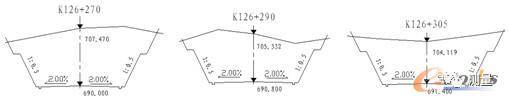根據縱曲線數據計算出K126+270、K126+290、K126+305斷面的中樁高程為分別為690.000、690.800、691.400。K126+270斷面的標準圖形根據點位坐標(100,690.000)在CAD中按照路面橫坡往兩側繪制路基線,然后在兩側將邊坡線連接在路基的兩邊。如果后面的斷面與本斷面也是相同的話,使用CAD中的Copy命令進行復制。方法是在文本窗口中:選擇所有線形,回車確認后在“指定基點或位移”時我們將基點選擇在(100,690.000),對于后面的“指定位移的第二點或 <用第一點作位移>:”時輸入(300,690.800)回車后繼續輸入(500,691.400)。這樣K126+290、K126+305的標準斷面就成了。