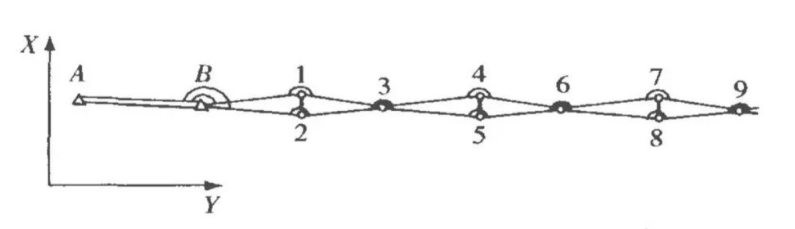通過這種布網(wǎng)方式使兩條導(dǎo)線形成公共點(diǎn)或者公共邊,構(gòu)成檢核條件。隨導(dǎo)線長度的延伸,兩條導(dǎo)線可以在適當(dāng)?shù)奈恢迷俅蜗嘟换蛑睾希瑒?chuàng)造出新的檢核條件。