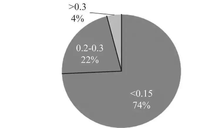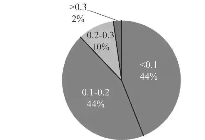 在本次精度統(tǒng)計中,平面位置誤差最大為0.331m,最小為0.032m,中誤差為0.141;高程誤差最大為0.334m,最小為-0.001m,中誤差0.135m。為了更好地了解數(shù)據(jù)精度,本次也對誤差區(qū)間做了統(tǒng)計見圖5和圖6。