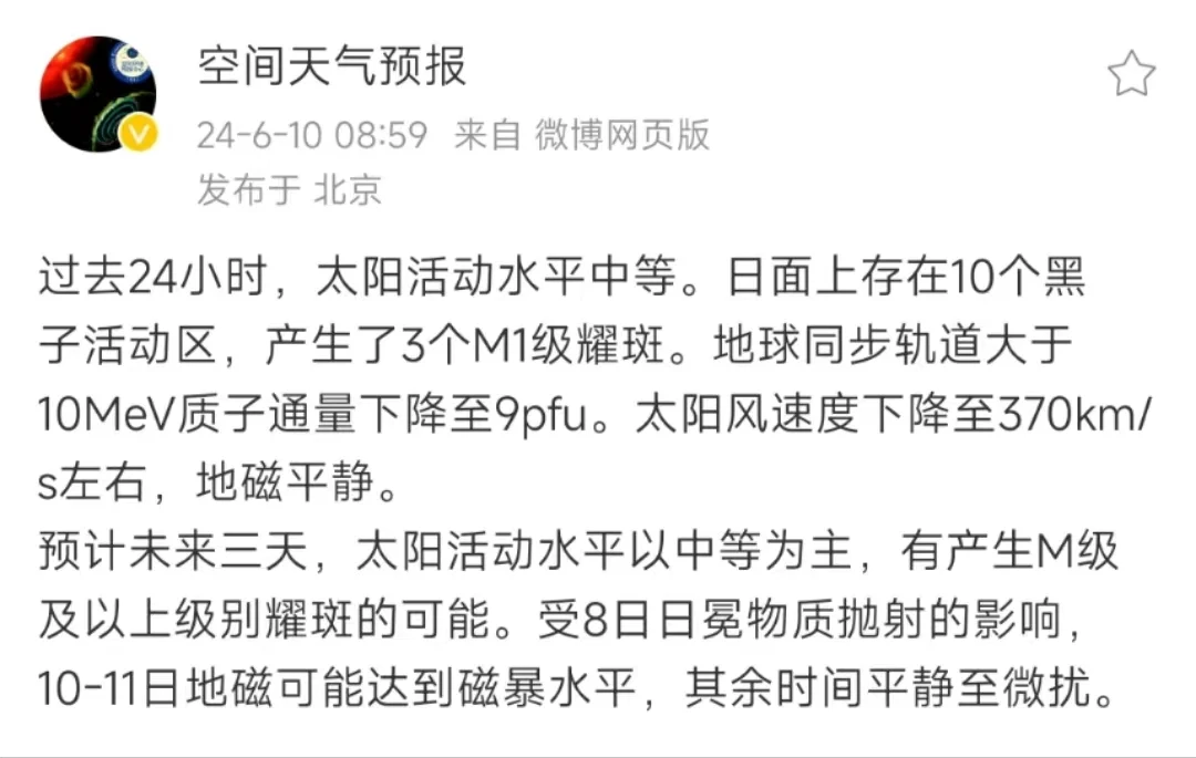 近日,太陽活動水平以中等為主,有產生M級及以上級別耀斑的可能。受8日日冕物質拋射的影響,10-11日地磁可能達到磁暴水平,其余時間平靜至微擾。