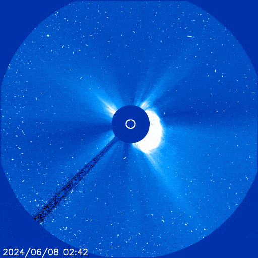 SOHO日冕圖像中的每一粒“雪”都是由一個充滿活力的質子撞擊航天器的相機引起的。透過這些“雪花點”,可以看到一個明亮的日晷從爆炸現場冒出來。