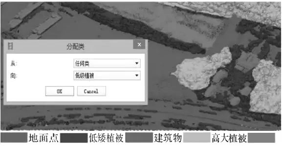 植被:試驗區植被根據樹木高度差異主要分為低矮植被和高大樹木兩類。利用抽樣調查的方式,對測區部分植被數據進行實地量測,通過求取平均值的方式確定試驗區低矮植被平均高度約為2m,高大樹木平均高度約為6m,因此,統一對分類后的植被高程值對應進行平差處理,從而得到近似的植被地面點坐標。