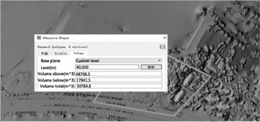 確定出測區邊界線,利用PhotoScan軟件體積量測功能,選擇自定義標高的模式,通過輸入設計標高40m進行體積量測,計算結果如下圖所示。通過計算可知,該測區挖方量為48706.3m3,填方量為17941.51m3,該測區凈填方量為30764.8m3。
