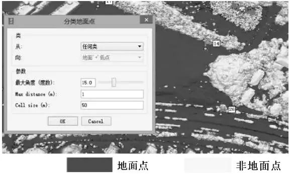 密集點云分類。對稀疏點云數據進行點云加密生成密集點云數據,這些數據往往包含一定的噪聲,同時各類地物數據混雜無法進行高程值修正,因此需要進行點云數據分類。點云分類分兩步:自動分類和目視修正。在進行自動分類前需要進行最大角度、最大距離和單元格大小等參數設置,其中最大距離是指有關點與地形模型之間距離,該參數確定了最大地面高程變化的情況;最大角度是指地形模型與將該新點與地面點構成連線之間的夾角,該參數確定了單元大小內的地面最大坡度情況;單元格大小是指要劃分為點云的小區大小,該參數根據不包含任何地面點的最大區域大小來劃分。由于測區分布較多的低矮植被且地形起伏較大,因此將密云被分成大小50m的單元格,將與地形模型相距距離設置為1m,地形模型與將該新點與地面點連線之間的夾角設置為15°。利用自動分類功能判斷3個參數值與檢測點的差值,當小于預定的3個參數值時,該點將被分類為地面點數據,自動分類結果如下圖所示。