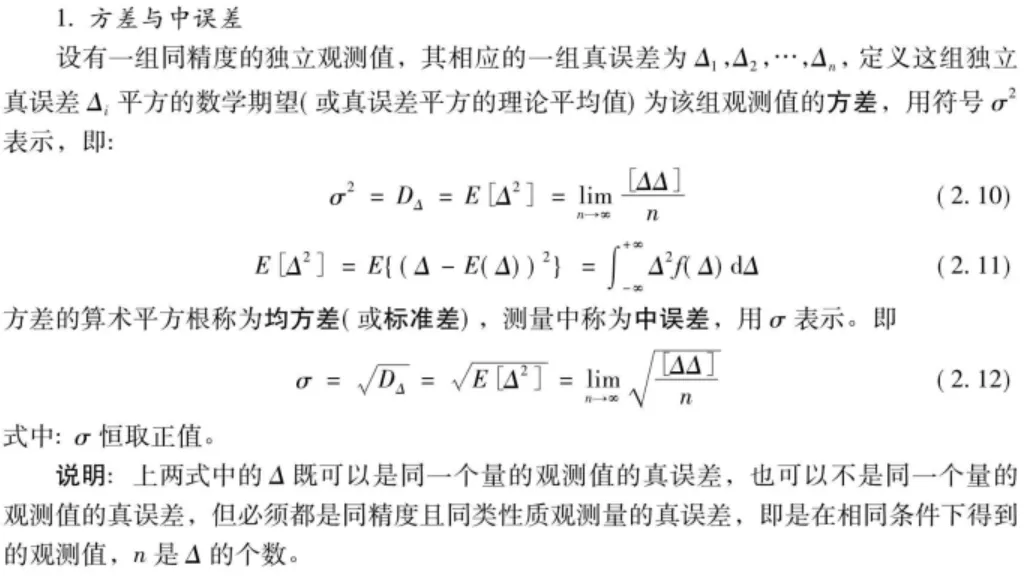 那么中誤差是怎么計算出來的呢?在相同觀測條件下,對同一觀測對象進行多次獨立觀測,并獲得多個觀測值,每個觀測值與真值均存在一個真誤差,用這些真誤差的平方和除以觀測個數,就得到這組觀測值的方差,方差的算術平方根就是觀測值的中誤差。